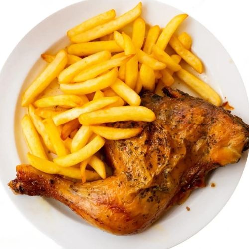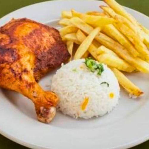 Pollo al horno con arroz y papas fritas caseras